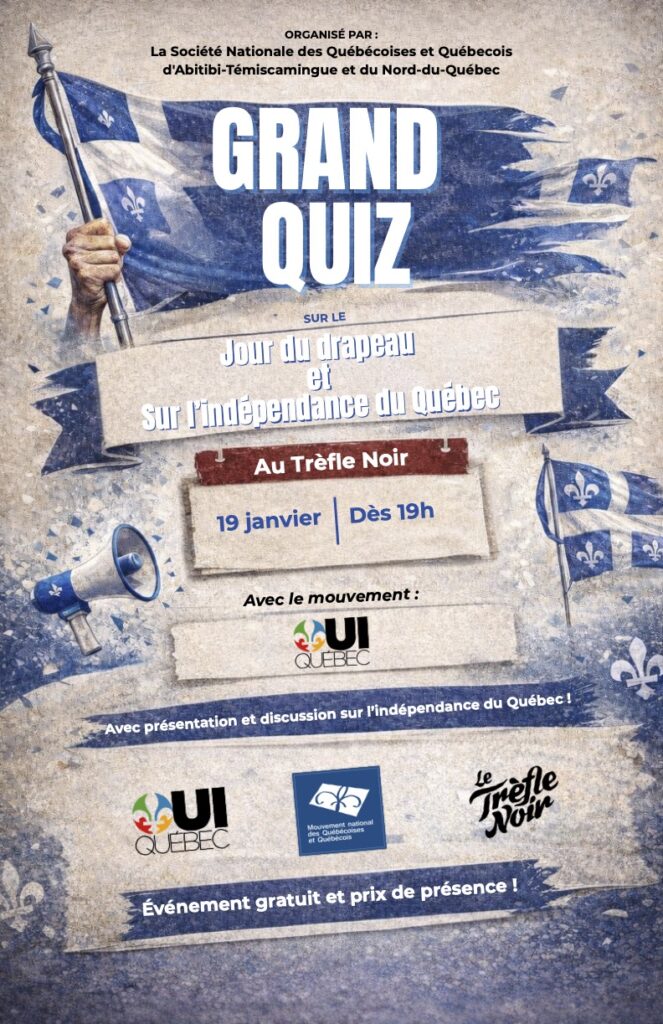 La Société nationale vous invite à participer à un jeu-questionnaire sur le Jour du drapeau et l’indépendance du Québec, en présence de représentants des OUI Québec. Une présentation et une discussion sur l’indépendance précéderont le jeu-questionnaire.